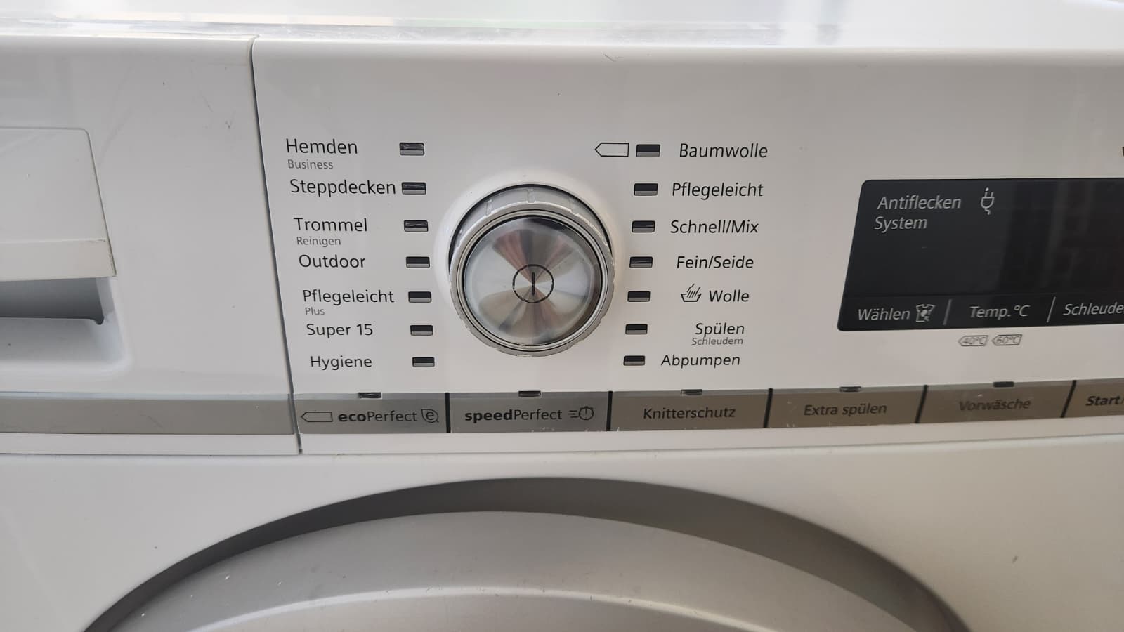 • Zusatzoptionen: Einweichen, Extra Spülen, Flecken, Kalt, Knitterschutz am Programmende, Schleuderdrehzahl/ohne Schleudern, Start/Pause mit Nachlegefunktion, Temperatur, VarioSpeed, Vorwäsche